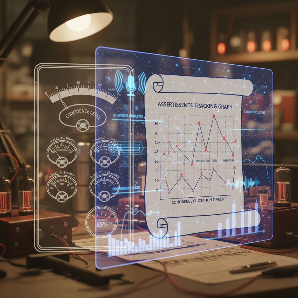 Advanced confidence detector analyzes vocal tone, speech pace, assertiveness patterns, and certainty indicators to measure speaker confidence levels throughout presentations.