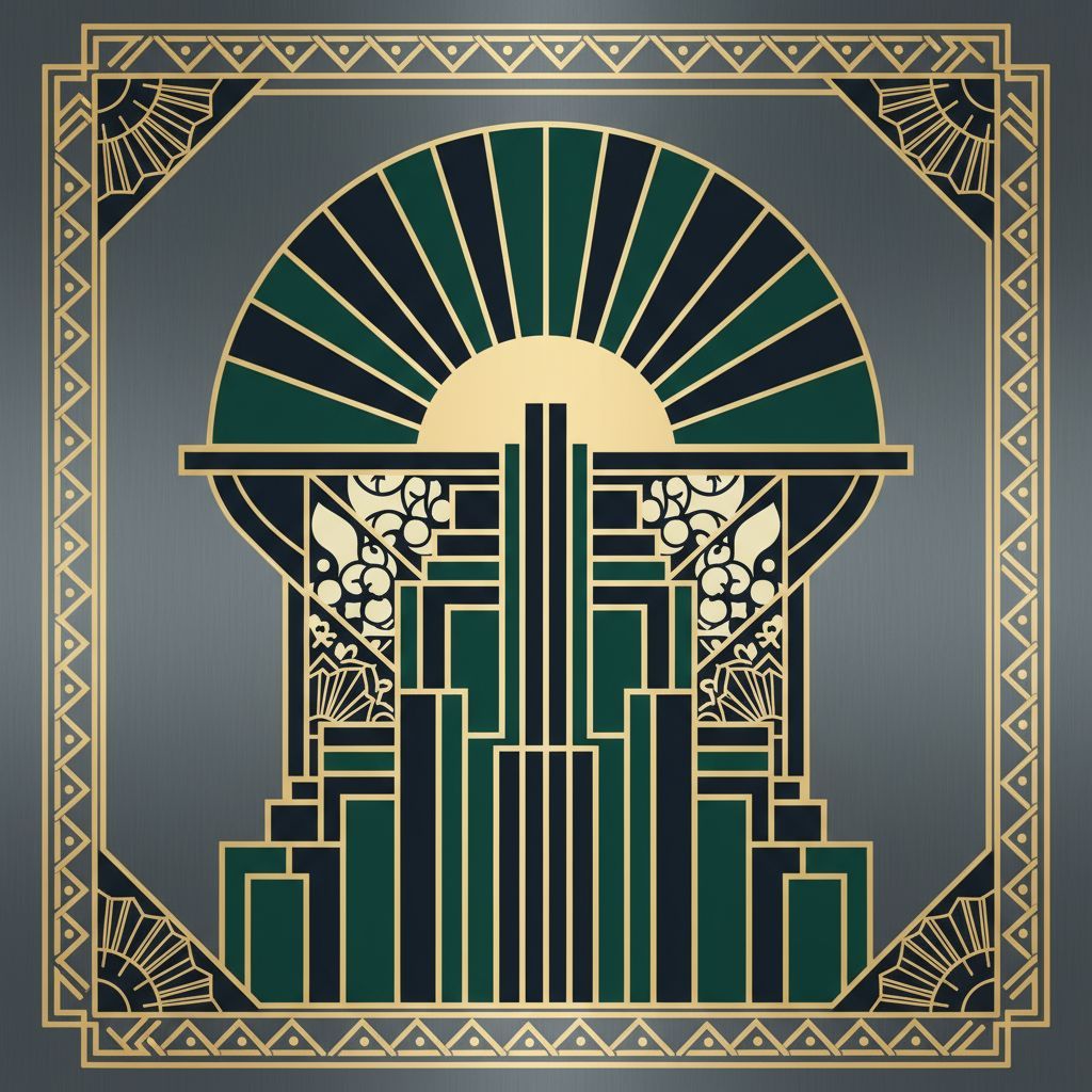 Generate elegant Art Deco designs inspired by the 1920s. Features geometric patterns, symmetry, luxurious materials (gold, chrome), and stylized decorative forms.