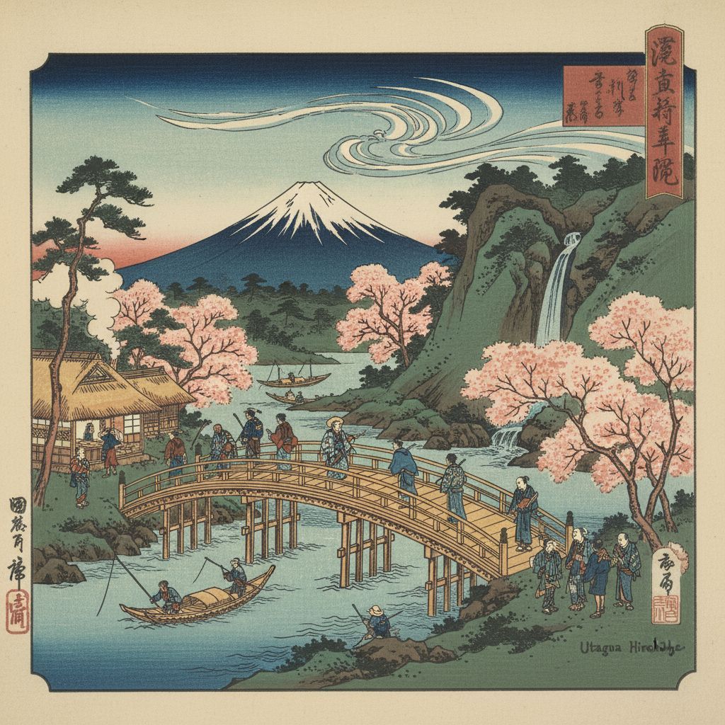 Generate Japanese Ukiyo-e woodblock prints inspired by Hokusai. Features bold outlines, flat colors, and scenes of landscapes, history, or everyday life.